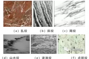 花紋:由裝飾石材的組分、結(jié)構(gòu)、構(gòu)造而呈現(xiàn)的圖像。花紋對石材非常重要,是衡量石材是否具有好的裝飾性能的重要指標。花紋有直紋、斜紋、亂紋、網(wǎng)紋、點紋、無紋、山水紋、波浪紋、斑紋之分。如圖3。直紋紋路近似…
