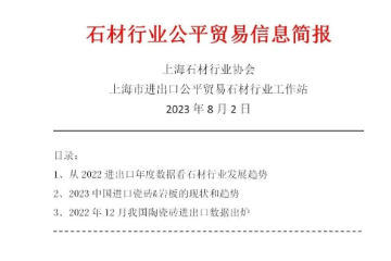 石材行業(yè)公平貿(mào)易信息簡報上海石材行業(yè)協(xié)會上海市進出口公平貿(mào)易石材行業(yè)工作站2023年8月2日日錄:1、從2022進出口年度數(shù)據(jù)看石材行業(yè)發(fā)展趨勢2、2023中國進口瓷磚巖板的現(xiàn)狀和趨勢3、2022年12月我國陶瓷磚進出口…