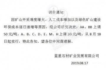 調(diào)價(jià)通知因礦山開采難度增大、人工成本增加以及綠色礦山建設(shè)環(huán)保成本逐日遞增等原因,經(jīng)公司研究決定:AA、BB上調(diào)50元/噸,A、B、C、D、E、H上調(diào)30元/噸,從8月18日起實(shí)行,特此告知。望各位中間商理解。藍(lán)星石材…