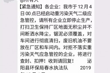 河南駐馬店泌陽發(fā)布關(guān)于啟動(dòng)重污染天氣橙色預(yù)警(Ⅱ級)響應(yīng)的通知,而所有石材企業(yè)必須立即停止生產(chǎn)。@所有人【緊急通知】各企業(yè):我市于12月4日00點(diǎn)已經(jīng)啟動(dòng)重污染天氣二級應(yīng)急管控,請所有企業(yè)立即停止生產(chǎn),…