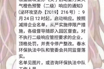 @【通知】春水鎮(zhèn)各石材加工企業(yè):根據(jù)縣攻堅(jiān)辦《關(guān)于啟動(dòng)重污染天氣橙色預(yù)警(二級(jí))響應(yīng)的通知》(泌環(huán)攻堅(jiān)辦【2019】216號(hào)):9月24日12時(shí)起,啟動(dòng)響應(yīng)。按照減排企業(yè)名單,從嚴(yán)實(shí)施停限產(chǎn)措施,各級(jí)督導(dǎo)隨即入…