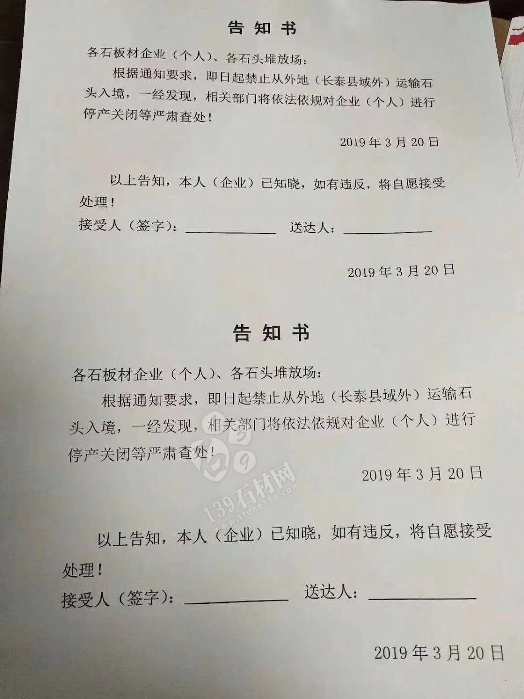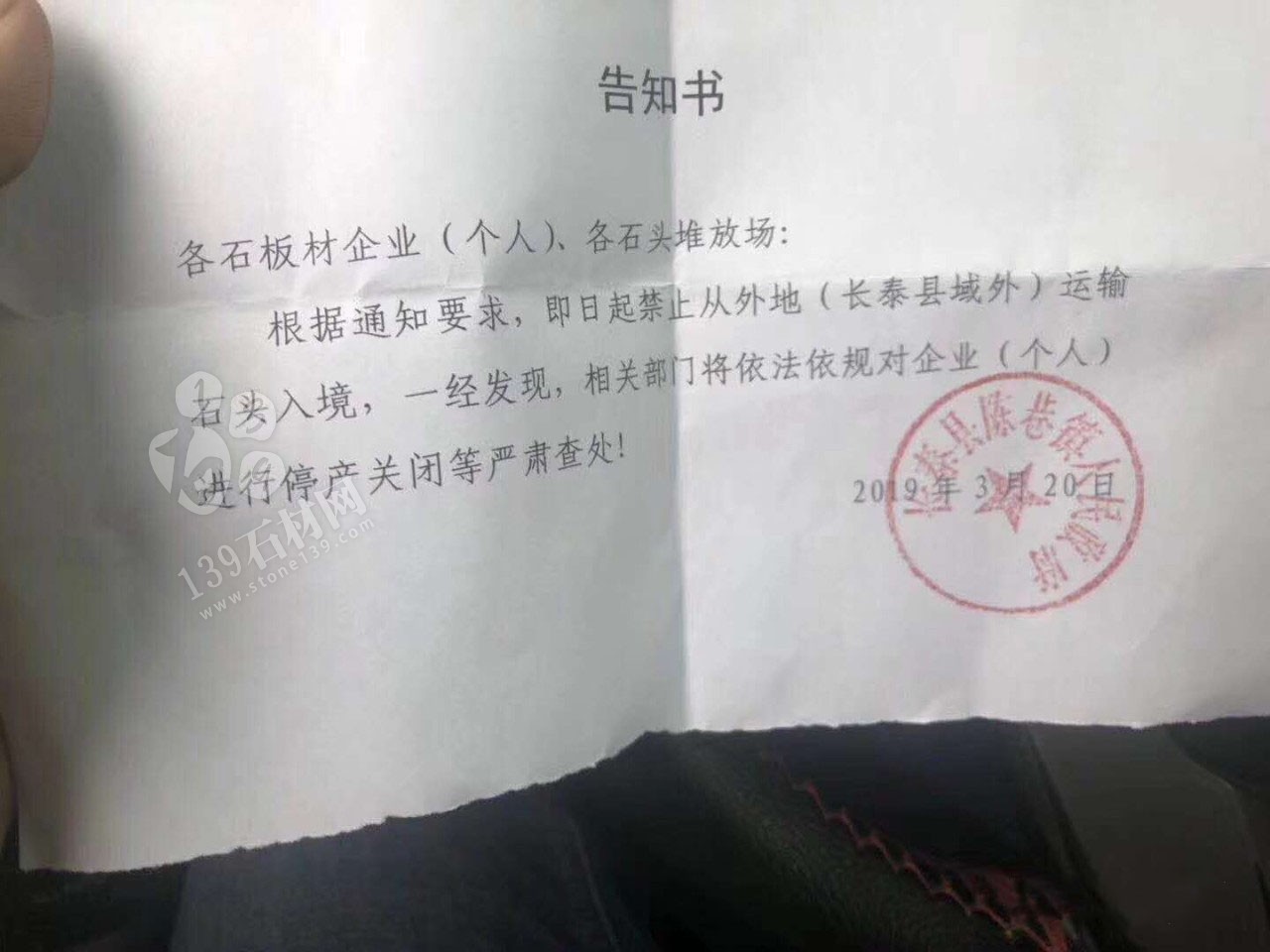 更有消息稱:長(zhǎng)泰縣禁止從外地運(yùn)輸石材入境,違者停產(chǎn)關(guān)閉處理,蓋章原件:
