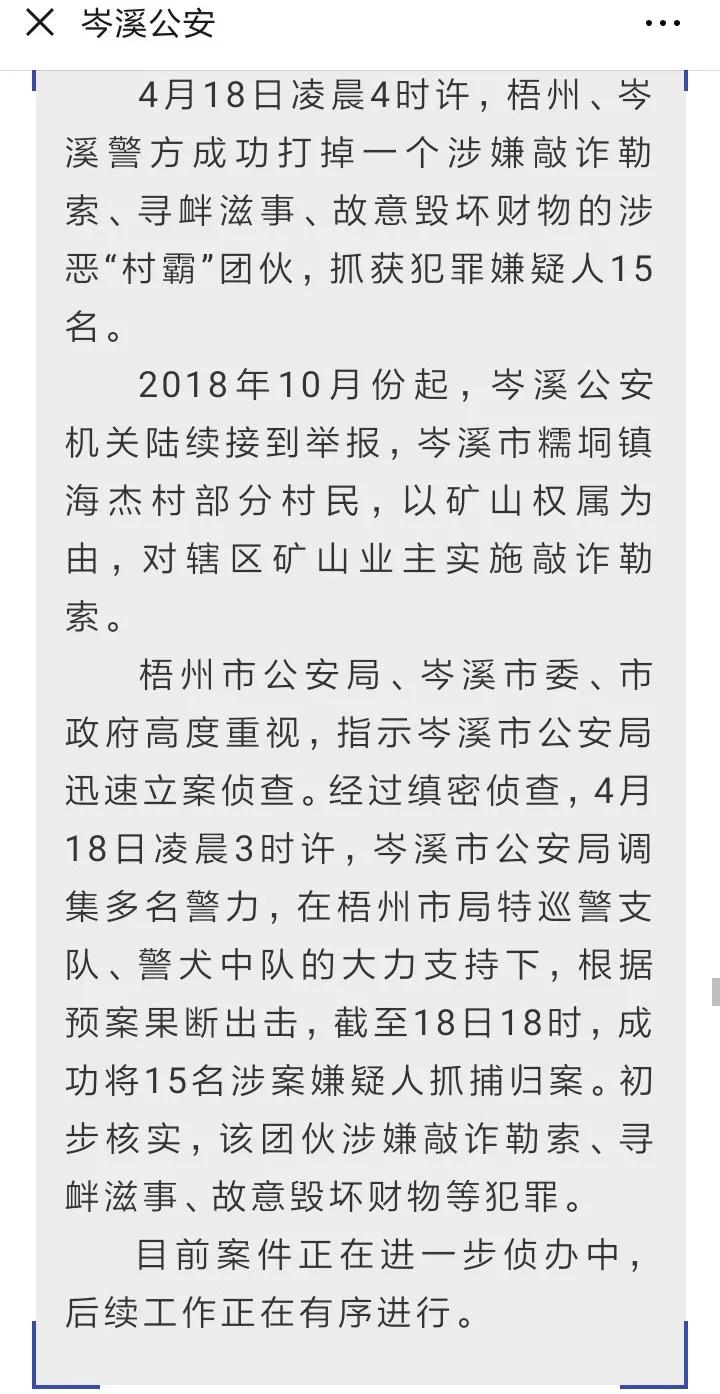 經(jīng)公安部門縝密偵查后,2019年4月18日,梧州、岑溪警方出警200多人,成功打掉涉嫌敲詐勒索、尋釁滋事、故意毀壞財物等犯罪的涉惡“村霸”團伙,抓獲犯罪嫌疑人15名。
