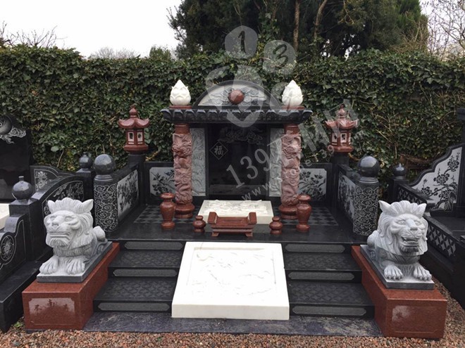 上圖中的豪華墓碑上,如果整座墓碑用漢白玉來制作的話,價格高昂不說,也凸顯不出它的藝術(shù)個性。但是如果部分地方用漢白玉來點綴的話,效果反而令人驚艷!碑頂上的兩座蓮花、墓碑蓋板、墓碑臺階中石浮雕面都是運用漢白玉浮雕來點綴,使得這座豪華墓碑更奢華、氣派!
