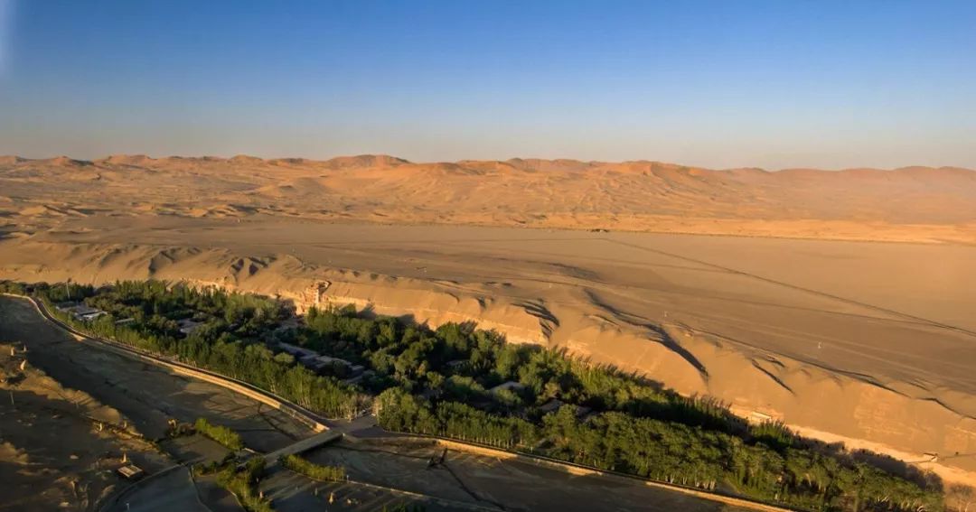 ▲ 莫高窟全景。植物繁茂處是以前的大泉河河谷,莫高窟在其后的崖壁處(方位上是河谷西側(cè))。遠處是鳴沙山,樂僔和尚就是站在那里望見了對面三危山上的金光(傍晚時分,東邊卻出現(xiàn)金光)。莫高窟坐西朝東,正對著三危山。攝影/吳健