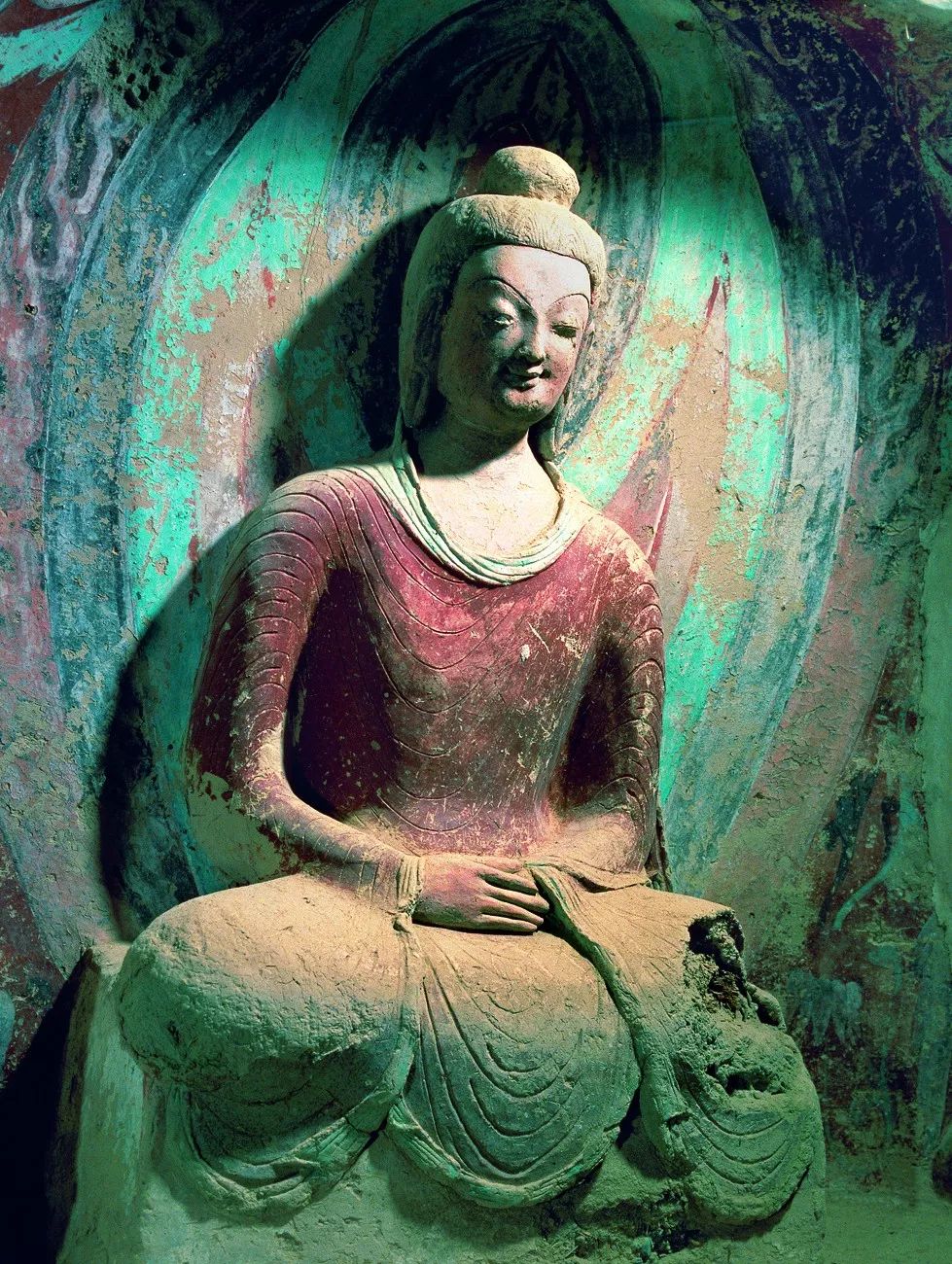▲ 莫高窟259窟彩塑佛像(北魏)。北魏時的造像有一個很明顯的特點:都具有平易近人的“微笑”。這種衣服上的“u形”花紋是模仿印度的造像。攝影/茹遂初