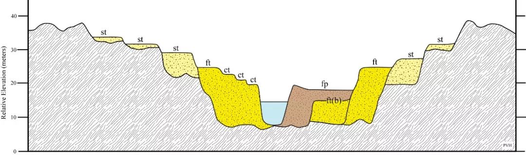 ▲ 地殼抬升時,原來的河谷底部會被整體抬上來,而河流下切,就會在外圍出現(xiàn)不再被水淹沒的部分,形成臺階狀的“階地”。一般而言,有幾級階地,地殼就抬升了幾次。階地面相對平坦,階地陡坎相對豎直。圖/wikipedia, Cristellaria