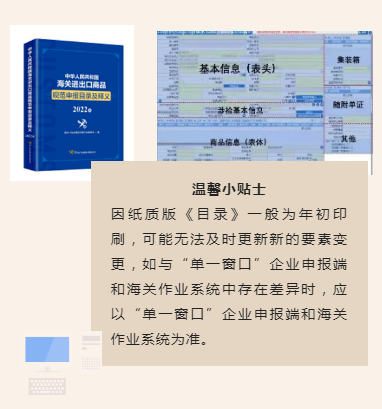 因紙質(zhì)版《目錄》一般為年初印刷,可能無(wú)法及時(shí)更新新的要素變更,如與“單一窗口”企業(yè)申報(bào)端和海關(guān)作業(yè)系統(tǒng)中存在差異時(shí),應(yīng)以“單一窗口”企業(yè)申報(bào)端和海關(guān)作業(yè)系統(tǒng)為準(zhǔn)。
