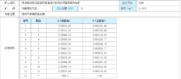 資源開發(fā)利用情況:本次出讓的恭城瑤族自治縣蓮花鎮(zhèn)蒲源村倒流水飾面用花崗巖礦屬于采礦權擴大礦區(qū)范圍。開采規(guī)模:100萬立方米/年。采礦權儲量分為兩部分,一部分為原采礦權已出讓未開采的可采資源儲量。另一部分為原采礦權平面范圍外擴大范圍的新增資源儲量,該部分儲量未進行有償處置。兩部分整合為一個礦權進行出讓。本次出讓為第二輪中央生態(tài)環(huán)境保護督察整改要求的整改礦山,涉及恭城縣蓮花蒲源倒流水花崗巖石場有限公司飾面花崗巖礦礦區(qū)范圍內(nèi)礦山資產(chǎn)及該礦山礦產(chǎn)品加工廠等資產(chǎn),經(jīng)評估資產(chǎn)共計人民幣23216.13萬元。