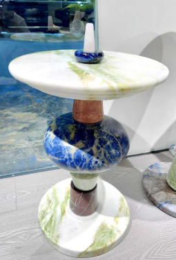 它采用模塊化拼接設(shè)計(jì),各部分石材在色彩、紋理與形態(tài)上相互碰撞,充滿視覺(jué)張力:桌面是圓形石材,底色潔白純凈,暈染著清新的淡綠色紋理,似碧波在素紙上暈開(kāi),質(zhì)感溫潤(rùn)細(xì)膩;支撐結(jié)構(gòu)層次豐富,中間有一顆飽滿的球形石材,以深邃的藍(lán)為主調(diào),交織著金褐色天然紋路,像把星河凝于其中,華麗又神秘;周圍搭配棕紅色、淺綠、棕褐等色調(diào)的石材部件,或呈錐形、或?yàn)橹危谋砻娴募y理與色澤過(guò)渡自然,讓各部分銜接充滿設(shè)計(jì)巧思。頂部還點(diǎn)綴著小型藍(lán)色石材底座與白色尖狀物件,如點(diǎn)睛之筆,增添了精致感。