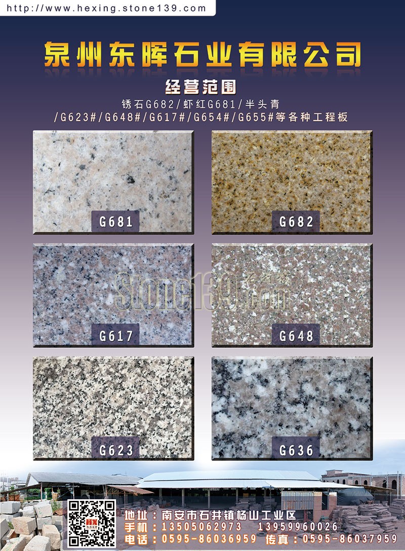 泉州東暉石業(yè)有限公司坐落于中國石材之鄉(xiāng)南安石井鎮(zhèn),主營產(chǎn)品有G606、G617、越南黃、681#、682#、603#、G654、G655等花崗巖石材,另外和興石材有專業(yè)的水沖加工隊伍,噴砂水沖加工、國內(nèi)外各種石材干掛板.