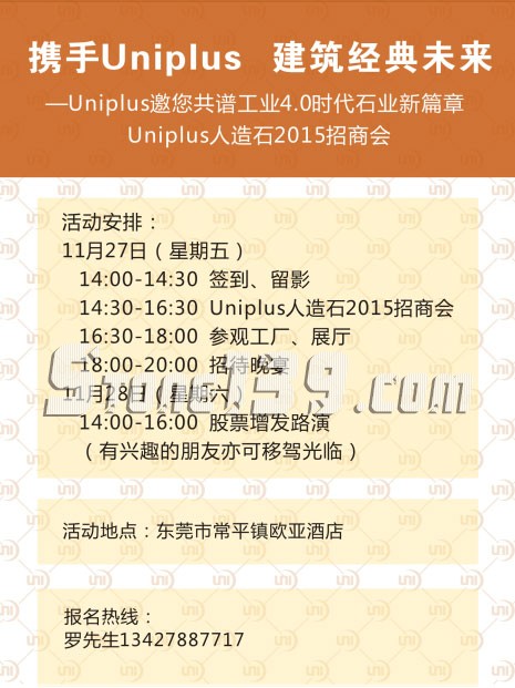 Uniplus是環(huán)球石材集團(tuán)旗下的高端人造石品牌,此品牌人造石由意大利百利通人造石生產(chǎn)全自動(dòng)設(shè)備生產(chǎn),達(dá)到世界級(jí)標(biāo)準(zhǔn),現(xiàn)已正式對(duì)外招商。獲悉,在11月27日將舉行“攜手Uniplus 建筑經(jīng)典未來(lái)”為主題的招商活動(dòng),另外11月28日還將進(jìn)行股票增發(fā)路演。