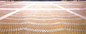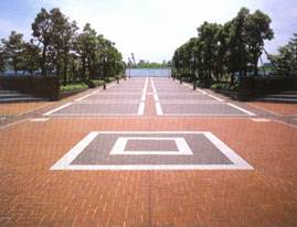 不同顏色的機磚與預制水泥塊形成的方形圖案,以幾何體的紋樣,突出路面的遠近透視