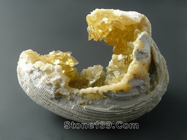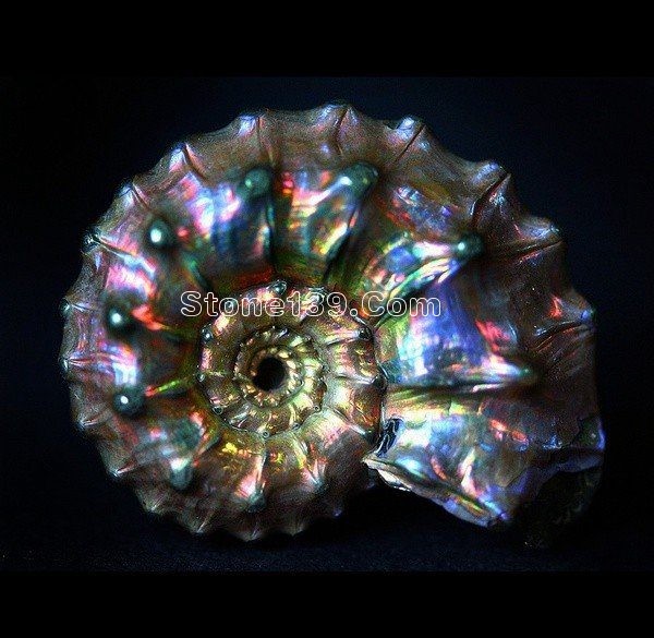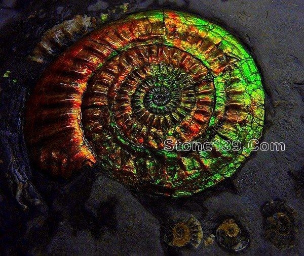 彩斑菊石 (Ammonite)約有8000萬(wàn)年到一億年以上 ,產(chǎn)于加拿大亞伯達(dá)省,因表面光澤間的層距繞射效應(yīng),令其呈現(xiàn)獨(dú)特類似歐泊的變彩。彩斑菊石主要成分為方解石,是一種菊石化石,經(jīng)數(shù)千萬(wàn)年在地底轉(zhuǎn)化而成,后因洛磯山脈地殼變動(dòng),才完整呈現(xiàn)于世。