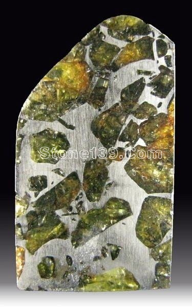 橄欖隕鐵:比較罕見的一類隕石,占隕石數(shù)量的2%~4%。主要由橄欖石和組成基質(zhì)的鐵鎳金屬構(gòu)成;其中的橄欖石呈單晶體形,比任何的其他的隕石類型所含的單晶體都大,還會(huì)形成聚集體。