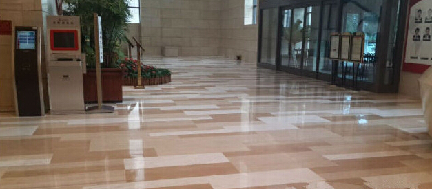 此次案例分享是某銀行總部大廈,地面洞石的污染清洗、光固化、整體研磨、結(jié)晶硬化處理工程。總面積:1700平方。