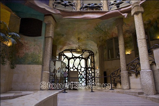 米拉公寓的內(nèi)部,每一戶都能雙面采光,光線由采光中庭和外面街道進來,房間的形狀也幾乎全是圓型設(shè)計,天花板、窗戶、走廊、很少有正方的矩形。米拉之家有一些宗教色彩,在它的外墻高處可以看到一個 M 字,代表圣母瑪利雅 Maria,可以看到一朵玫瑰浮雕,代表圣母瑪利雅(Virgen del Rosario / Our Lady of the Rosary),也代表米拉夫人的名子 Roser,可以看到一行浮雕的字“Ave - Gratia - M - Plena - Dominus - Tecum”,代表“上帝拯救你,瑪利雅,你充滿恩典,上帝與你同在”。