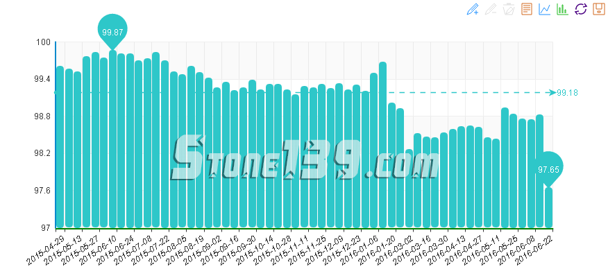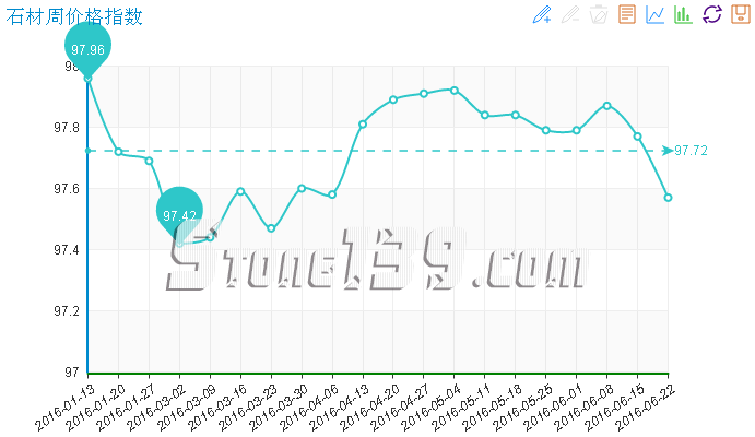 據(jù)“中國(guó)·水頭石材指數(shù)”系統(tǒng)監(jiān)測(cè),20160622期石材周價(jià)格指數(shù)收?qǐng)?bào)于97.57點(diǎn),環(huán)比下調(diào)約0.20點(diǎn),下調(diào)0.21%。本周石材價(jià)格繼續(xù)下滑,其中其他石材類價(jià)格繼續(xù)持平,除合成大理石價(jià)格持續(xù)攀升外,大理石、花崗石類價(jià)格均出現(xiàn)下調(diào),特別是花崗石價(jià)格的大幅回落帶動(dòng)本周石材價(jià)格呈現(xiàn)下行的態(tài)勢(shì)。本周除少數(shù)合成大理石大板質(zhì)量等級(jí)高、市場(chǎng)需求增加,價(jià)格持續(xù)上調(diào)外,花崗石荒料及成品價(jià)格均隨市場(chǎng)行情下滑而下跌。