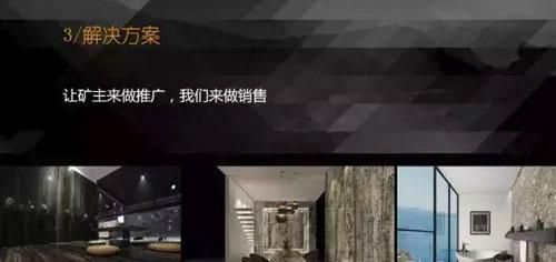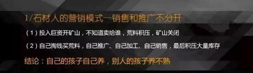 所以呢,我覺得我們應該清楚的曉得:礦主應該來做推廣,我們應該來做銷售。所以未來,我相信大家應該知道,我們做石材的應該跟礦主是什么關(guān)系。或者我們應該是拿錢還冤枉的買很多的無用的石頭放在倉庫里頭嗎?你的錢沒有那么多了。