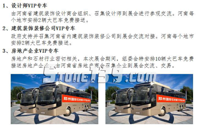 應(yīng)政府要求,組委會(huì)決定于9月3-5日展會(huì)期間,派遣大巴車到鄭州市、開(kāi)封市、平頂山市、洛陽(yáng)市、商丘市、安陽(yáng)市、新鄉(xiāng)市、許昌市、鶴壁市、焦作市、濮陽(yáng)市、漯河市、三門(mén)峽市、周口市、駐馬店市、南陽(yáng)市、信陽(yáng)市、濟(jì)源市等河南18個(gè)地市,免費(fèi)迎接設(shè)計(jì)師、房地產(chǎn)企業(yè)、建筑裝飾裝修公司、風(fēng)景園林機(jī)構(gòu)等石材直接使用方到展會(huì)與石材企業(yè)一對(duì)一交流對(duì)接。