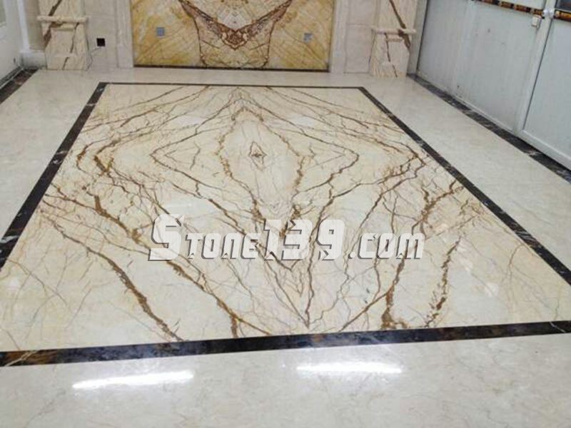 材質(zhì)特征:索菲特金材料風(fēng)格與金蜘蛛有幾分神似,材料的底色很淺,光度非常好,釉面感強,板面的金黃色紋線,有行云流水般的動感,是一個很有特色的材料。