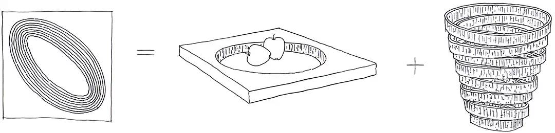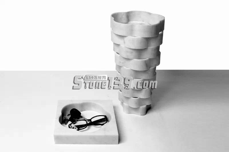采用同心造型的方法,對大理石進行切割,往上拉伸疊加起來可以形成花瓶。內外表面獨具特色的天然裝飾,花瓶剩下的材料可以當做果盤使用。