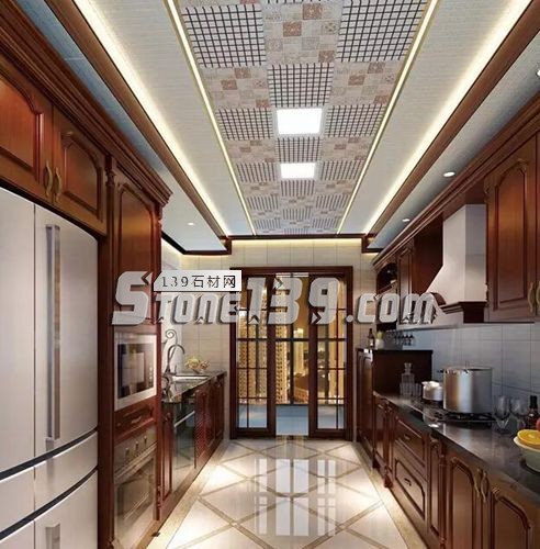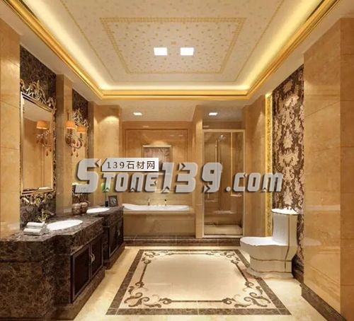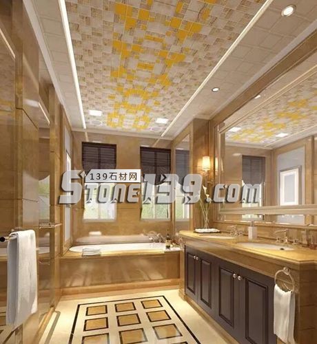 衛(wèi)浴以暖色吊頂為主,通過隨性的方式來完成馬賽克的經(jīng)典拼圖,營造了繁星點點般的自然浪漫氣息。吊頂?shù)牟馁|(zhì)和大理石的硬朗,完美呼應,成功凸顯空間質(zhì)感的大牌范。