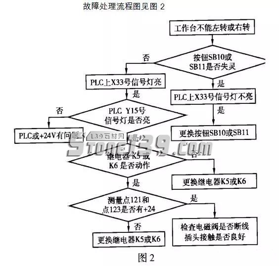 該機(jī)常見故障有:工作臺不能升起、不能左右旋轉(zhuǎn),切割過程中床身跑偏、鋸片進(jìn)給失控、床身移動有異響或卡住等。可用流程圖分析及排除故障。