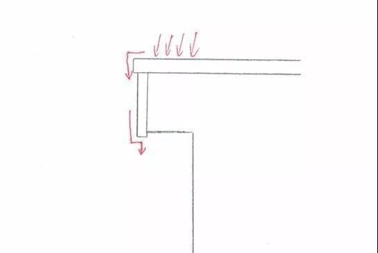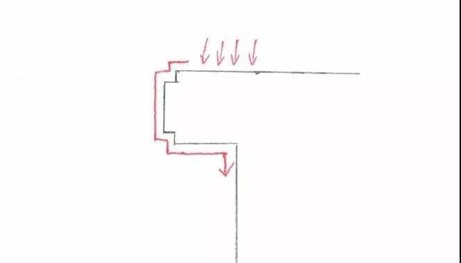 而正確的設(shè)計(jì),是應(yīng)當(dāng)如下圖所示。這種水,可以使雨水在每一個(gè)拐角處滯留一部分,并且滴落一部分,停留在石材上的比例大幅減小,一個(gè)輕微的改動(dòng)就可以大大改善石材使用中的水印效果。