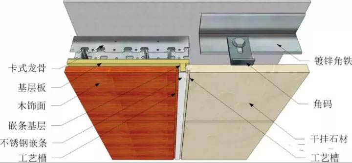 木飾面與石材交界邊緣如圖所示抽槽處理,石材壓木飾面,防止橫向工藝槽陰角處收口露空洞
