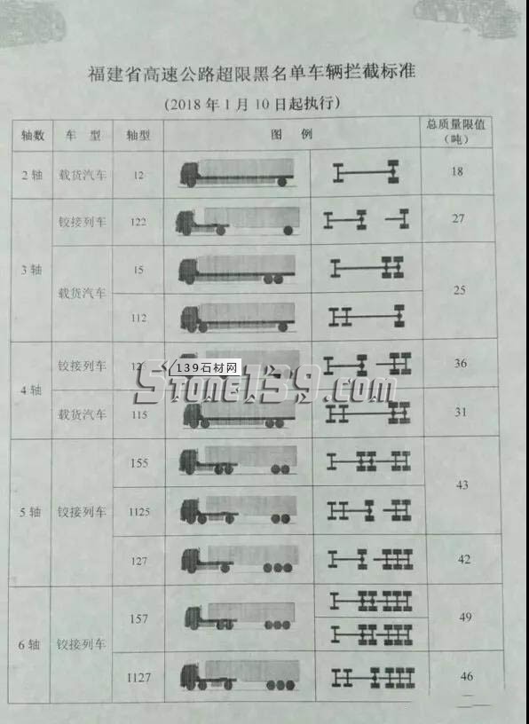 近日,有石材貨車司機提供了一張照片,上面顯示的是福建省高速公路超限黑名單車輛攔截標(biāo)準(zhǔn),該標(biāo)準(zhǔn)將從2018年1月10日起執(zhí)行。