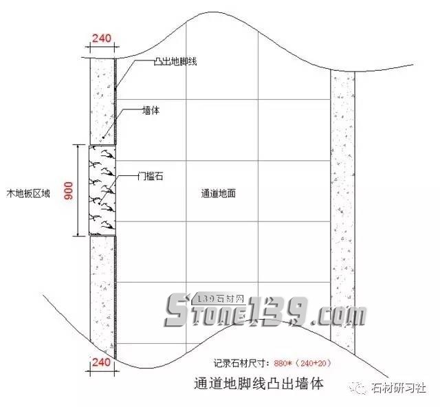 ▼第一個(gè)(這是一個(gè)通道和房間相連的門檻,地腳線是凸出來的樣式,測(cè)量記錄的尺寸是:880*(240+20),門洞的寬原尺寸是900減去了20是方便安裝時(shí)有空位,因?yàn)榘惭b房門時(shí)還可以遮住。墻厚原尺寸是240mm+20,兩邊各加10mm,因?yàn)槭牡孛妫ǖ匕宕u)和木地板安裝時(shí)都不可能緊靠密水泥墻,這也不方便安裝。所以需要加大尺寸來調(diào)節(jié),記錄240+20是一個(gè)技巧的問題,240是墻體,20是加大的尺寸,回去下單繪圖時(shí)不會(huì)忘記或出錯(cuò)。