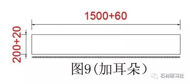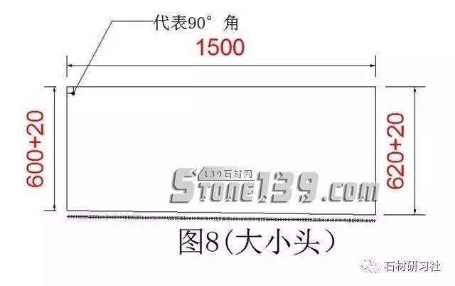 ▼第2個(gè)大小窗臺(tái)(圖8是一個(gè)大小頭的窗臺(tái),600,620和1500是水泥的數(shù)據(jù),加20是加厚磨邊的數(shù)據(jù),記得畫草稿時(shí),一定要記上90°的位置,要不以后搞反反向就安裝不了)