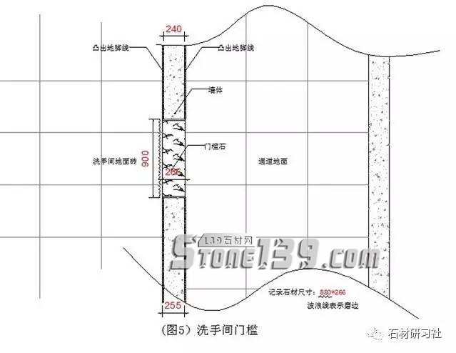 ▼第四個(gè)洗手間門檻(圖5是一個(gè)洗手間門檻,洗手間墻面如果還沒有貼磚,就事先和施工方溝通貼磚完成面是多少,才能測(cè)量記錄尺寸。我這里強(qiáng)調(diào)的是經(jīng)常出錯(cuò)的就是沒有和客戶溝通好墻完成面,靠洗手間那一邊是否要加厚,磨邊肯定是要的的。我們作為專業(yè)的石材設(shè)計(jì)師,應(yīng)該提議或提醒客戶需要磨哪一種邊最為恰當(dāng)。我個(gè)人建議的是R2小圓邊和2*2的斜邊。)