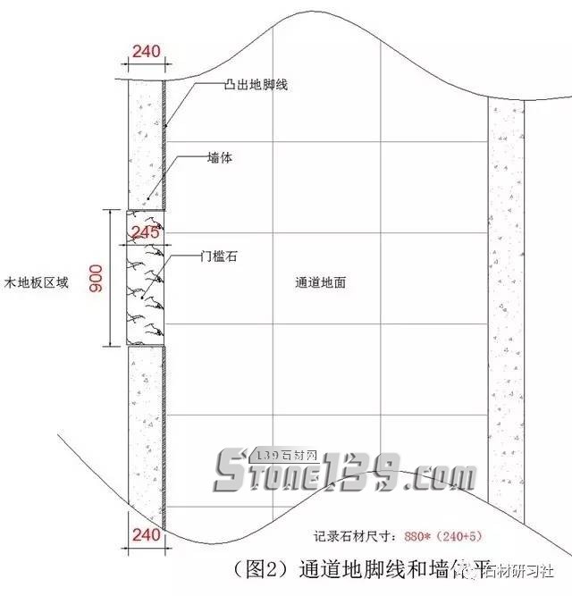 ▼第二個(gè)房門(圖2是一個(gè)墻面240厚,地腳線貼平墻體,所以考慮的是地磚需要嵌進(jìn)墻5mm,另外一邊就是比墻體出10mm,等于草稿記錄880*240+5,880是900已經(jīng)減去20)