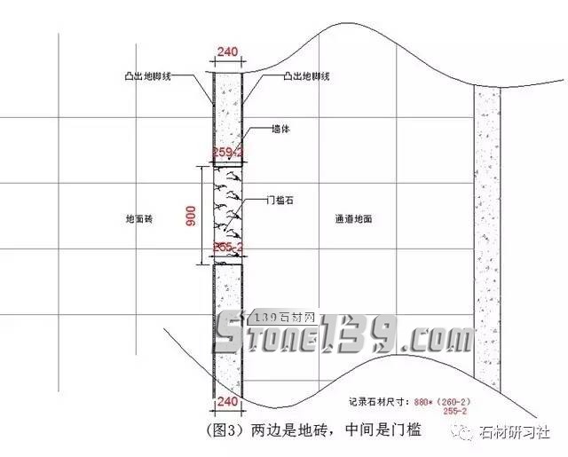 ▼第三個(gè)通道(圖3是一個(gè)墻面240厚,兩邊安裝師傅已經(jīng)鋪好了地磚,中間留出的一個(gè)空地方做門檻石,那就需要測(cè)量?jī)深^的尺寸然后再減去2mm,作為安裝移動(dòng)空間,大理石不是木頭,剛好和大一點(diǎn)都安裝不了。這個(gè)門檻石大小頭,記錄尺寸是880*260(255)-2.)。