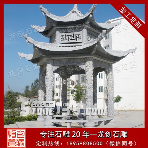 青石石涼亭是以青石石材建造而成,青石石材是比較易于雕刻并且可以雕刻出各種形式,比如浮雕、陰雕、透雕等等。加工上面也比較簡單,但是呈現(xiàn)的效果還是比較好的。