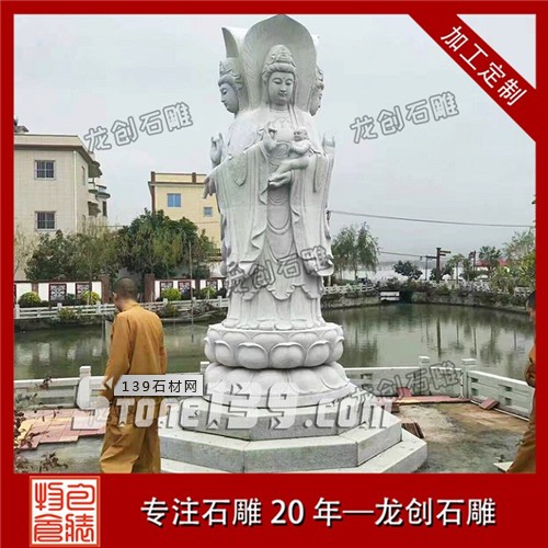 石雕站像的觀音通常是擺放在廣場(chǎng)或是在佛祖的旁邊,這種形象前面是以普度縱生的形態(tài)出現(xiàn),而后者是以學(xué)習(xí)佛法的學(xué)習(xí)者的姿態(tài)而存在,因此前者的表現(xiàn)是更為慈祥且隨和的,而后者的面部表情更像是在傾聽(tīng),專(zhuān)注,面部表情上會(huì)比較是嚴(yán)肅,但是虔誠(chéng)的一種表達(dá)。這一類(lèi)形態(tài)的觀音大都是白衣飄飄的白衣觀音,手持凈瓶或抱著小孩的凈瓶觀音和送子觀音。